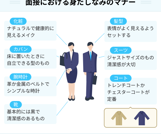 | 服装・持ち物確認 | 清潔感ある服装と必要書類(履歴書等)の準備. |