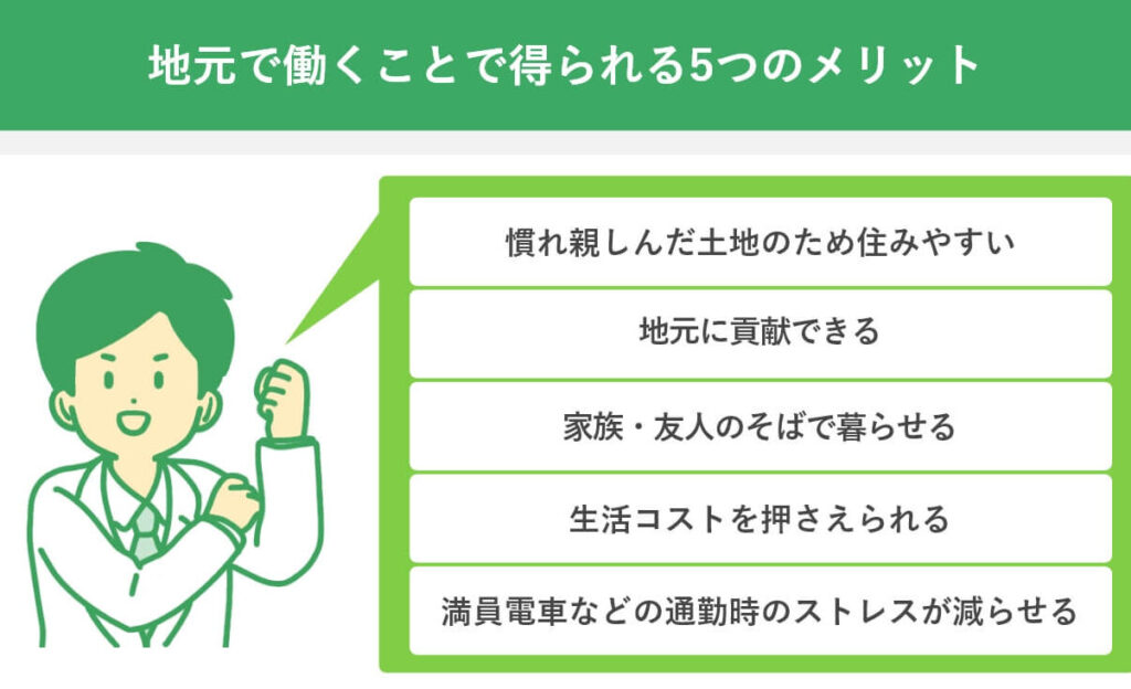 - 生活コストの削減: 地元で働くことで通勤時間や交通費を節約できるため、仕事とプライベートのバランスも取りやすくなります。