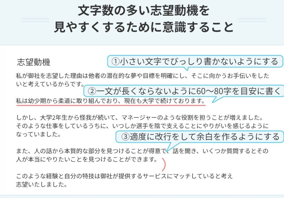 - 詳細解説(600字〜800字): より深く自己分析や企業研究を反映した内容を書くことが可能ですが、冗長にならないよう注意しましょう。