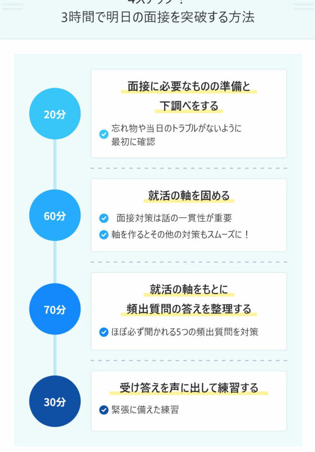 - 模擬質問への回答練習: 一人または友人と練習し、不安要素を取り除く。