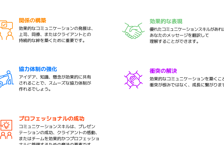 さらに、以下のような具体的なポイントにも留意することで、自らの非言語的コミュニケーション能力を高めていきたいものです: