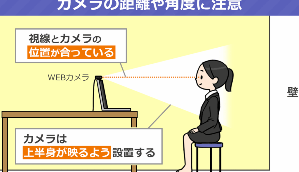 - 適切な距離感:顔全体が画面に収まるようにしつつ、背景も含めて整えた状態で映るよう心掛けます。
