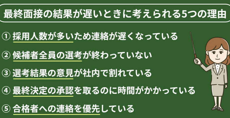 選考プロセスの複雑さは、最終面接の結果が遅くなる大きな要因となります。このプロセスには多くのステップが含まれており、それぞれに時間を要するため、候補者は長い待機時間を経験することになります。特に、企業が適切な人材を見つけるためには、慎重な判断が求められるため、この傾向はさらに強まります。