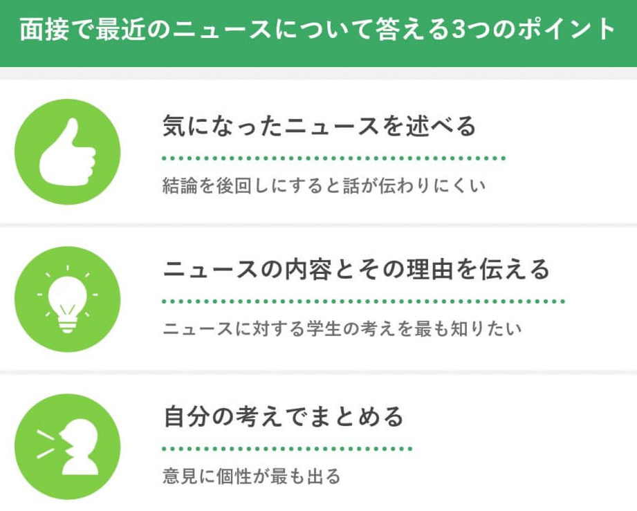 - 模擬練習: 友人などと模擬面接を行い、「最近気になるニュース」について質問された場合どんな答え方ができるか練習します。