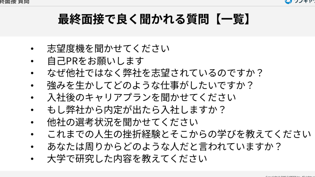 これらのポイントを押さえておくことで、「最終 面接 何 聞か れる」といった疑問にも答えられる準備が整います。また、このような質疑応答では、自信と誠実さも伝わりますので、自分自身でも納得できる回答づくりに努めましょう。