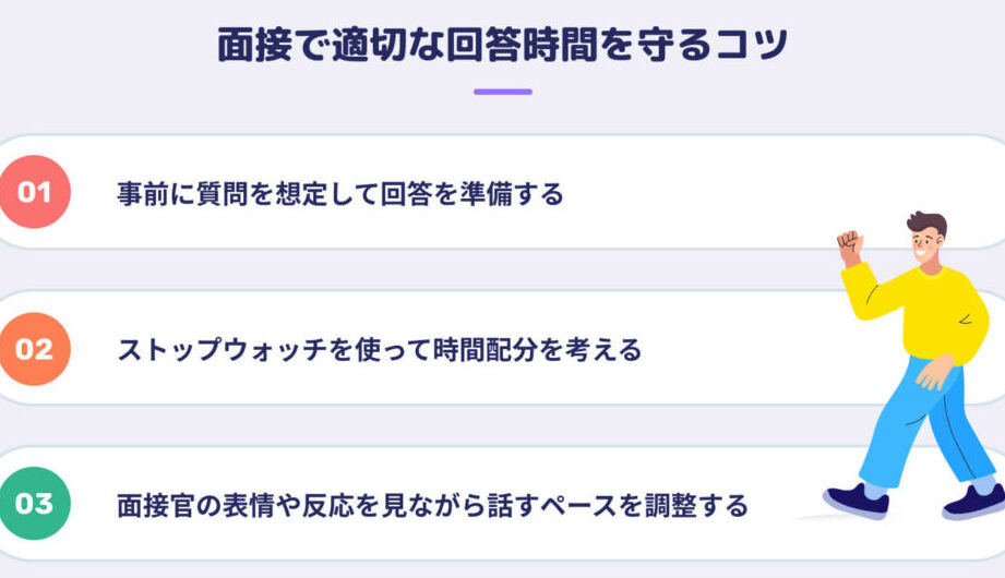 理想的な回答時間は、面接の内容や質問の種類によって変化します。私たちが目指すべきは、明確かつ簡潔に自分を表現することです。そのためには、各質問に対して適切な時間配分を意識することが重要です。