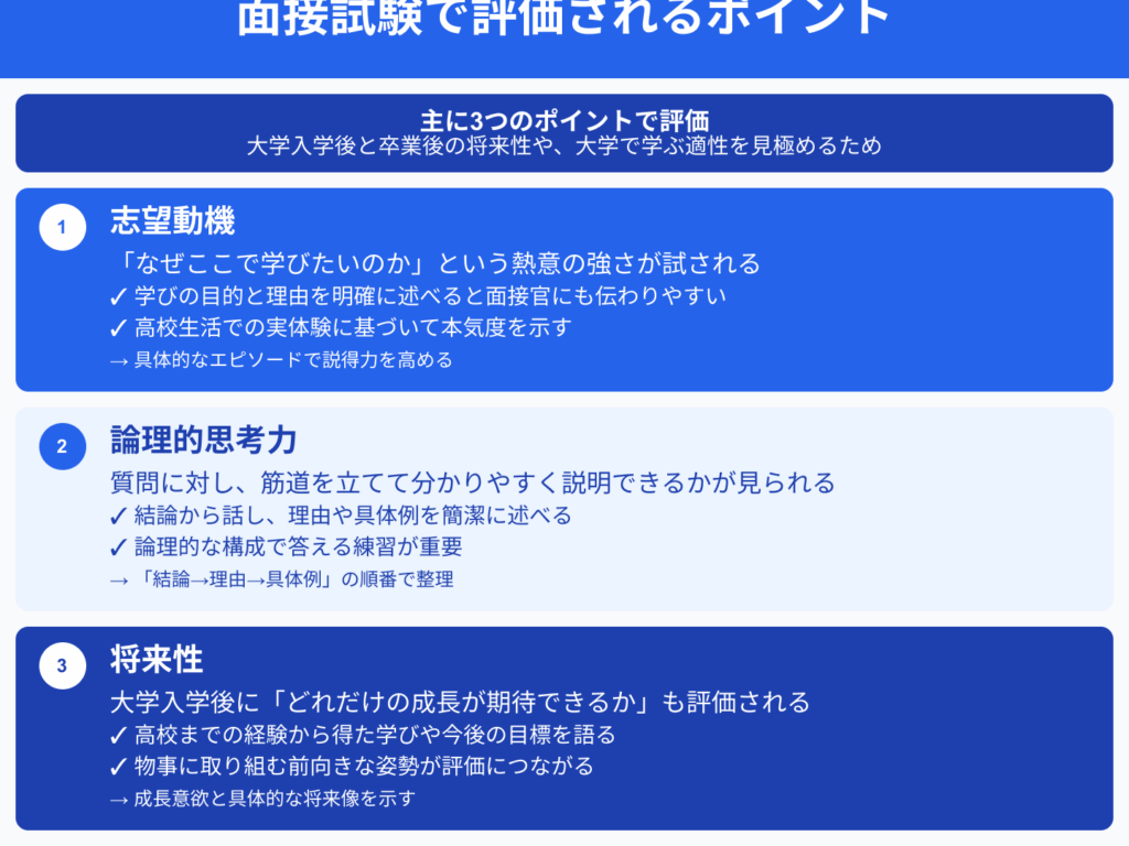 面接では、以下のようなポイントが重視されます: