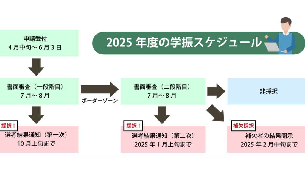 - 結果通知予定日: 通常、面接日の約2〜4週間以内に結果が通知されます。しかし、この期間は年度やプログラムによって異なる場合がありますので注意してください。