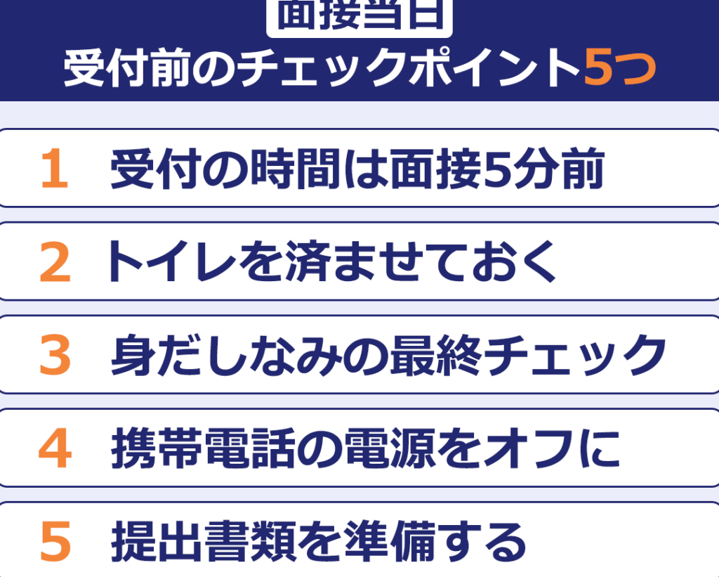 - 早めに到着: 面接会場には約10〜15分前には到着するよう心掛けましょう。この時間帯は緊張感を和らげたり、環境になじんだりするために役立ちます。