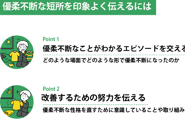 - 具体的なエピソード: 自分の短所とそれに対する取り組み方について具体例を挙げることで信頼感アップ。