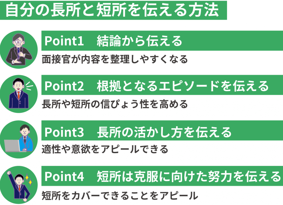 - 短所について具体的に話すことで、その後の長所の際立たせ方にも工夫が必要になります。